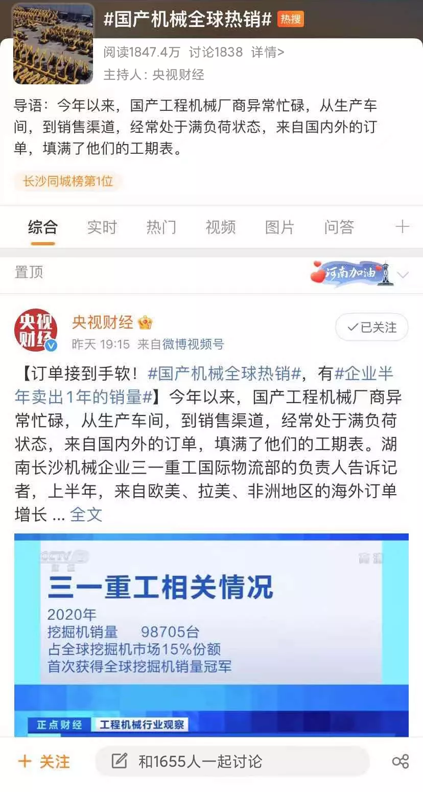报道一经播出,#国产机械全球热销#便冲上微博热搜,最高时排热搜榜第38名,累计阅读量超1800万,并在央视财经公众号头条、央视财经客户端首页引发网友高度关注。