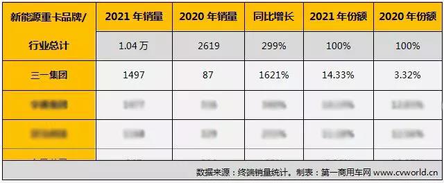 最终,三一新能源重卡全年累计销量达到1497辆,同比大增1621%,市场份额达到14.33%,较上年同期提升了11个百分点,斩获2021年度全国新能源重卡销量第一,一跃成为中国新能源重卡第一品牌。