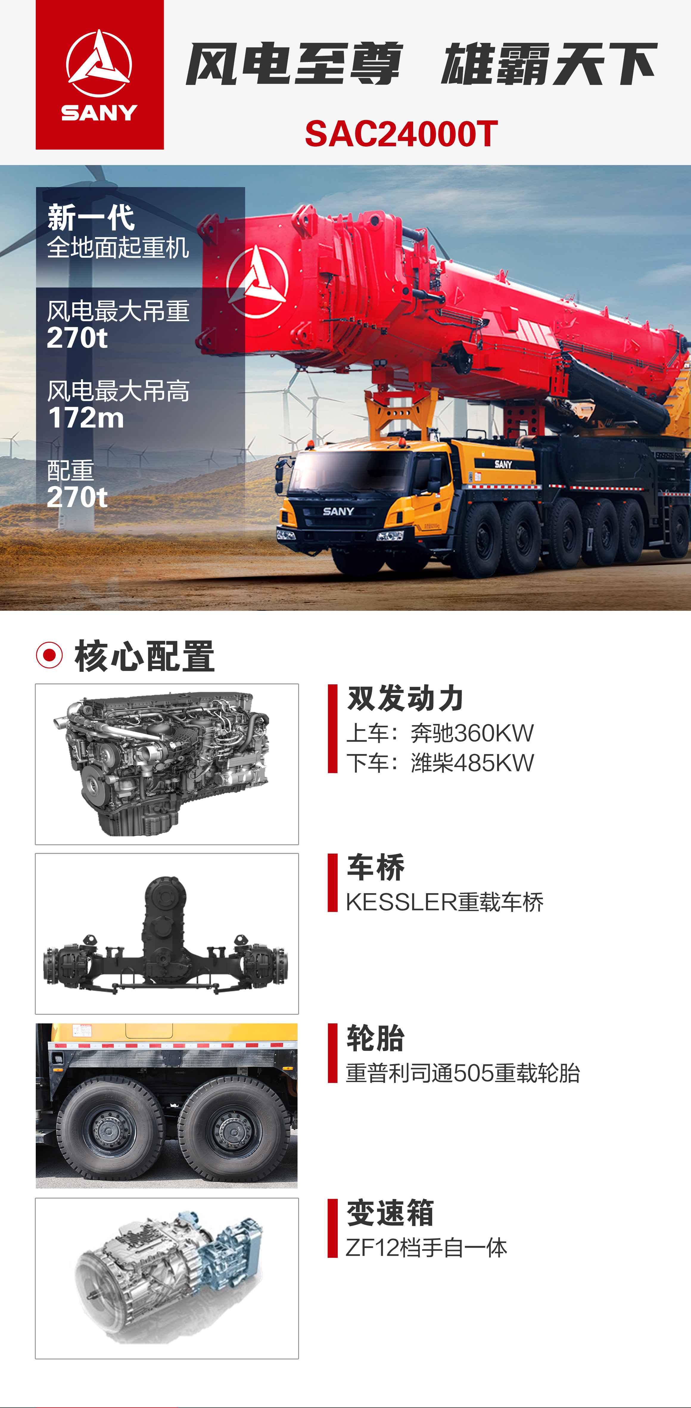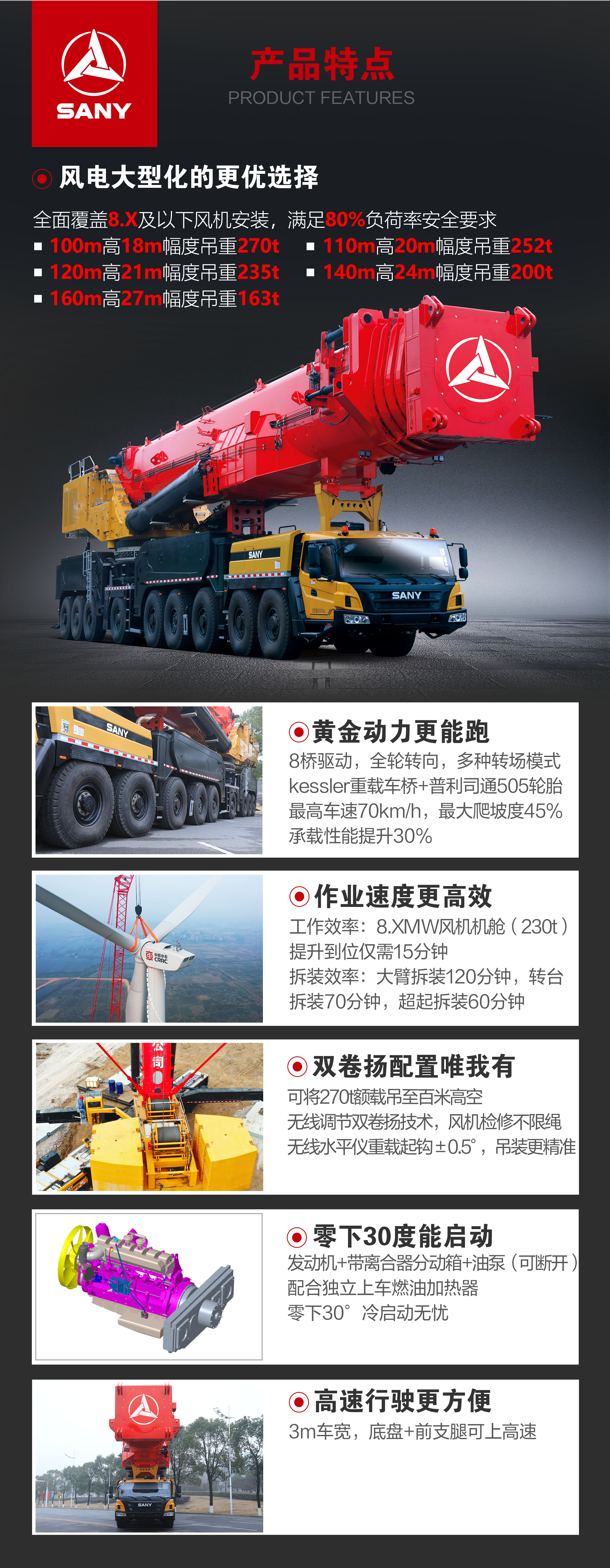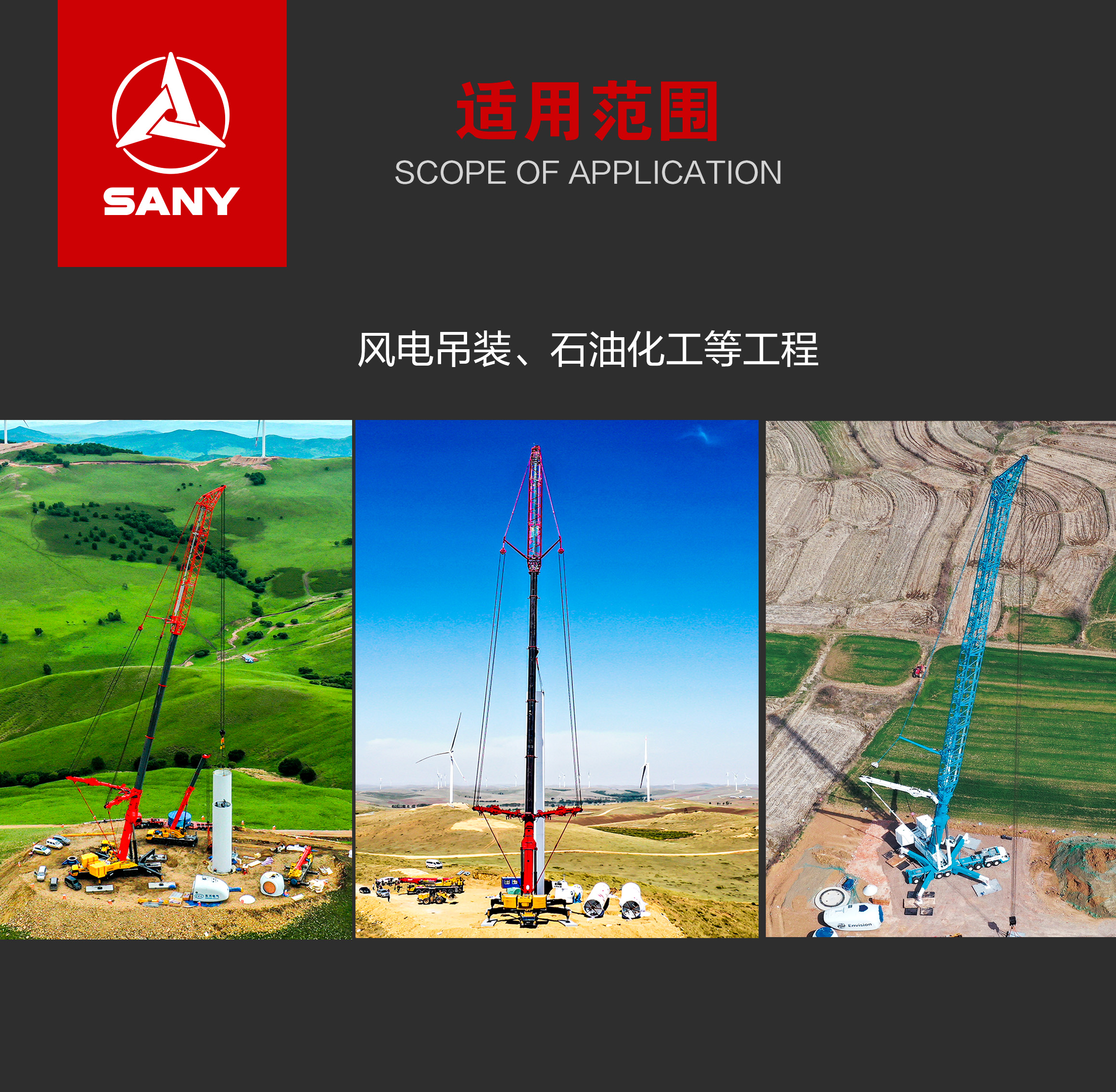 可将270载吊至百米高空;无线调节双卷扬技术,风机检修不限绳;无线水平仪重载起钩±0.5°,吊装更精准。