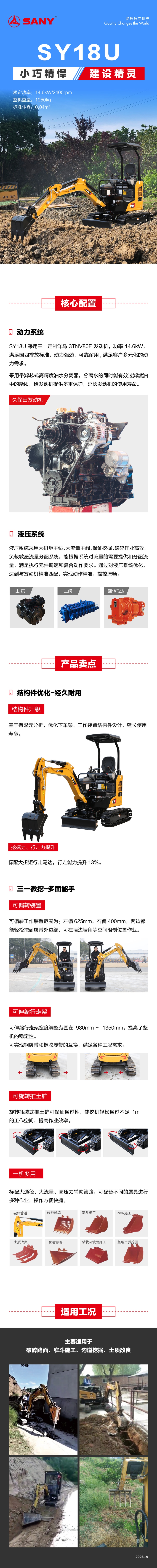 全新国四 SY18U 围绕“ 新动力 ”、“ 新造型 ”、“ 新技术 ”全面升级,其速度更快,效率更高,细节设计周全,多种属具与配置可选,实现一机多用,堪称微型挖掘机中的多面能手。