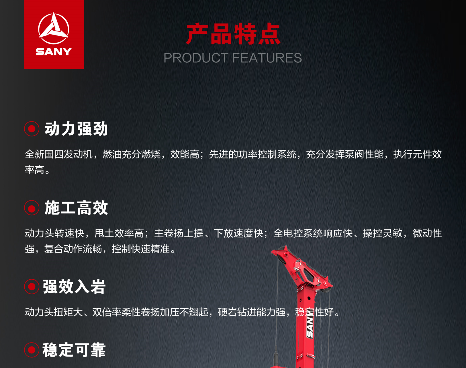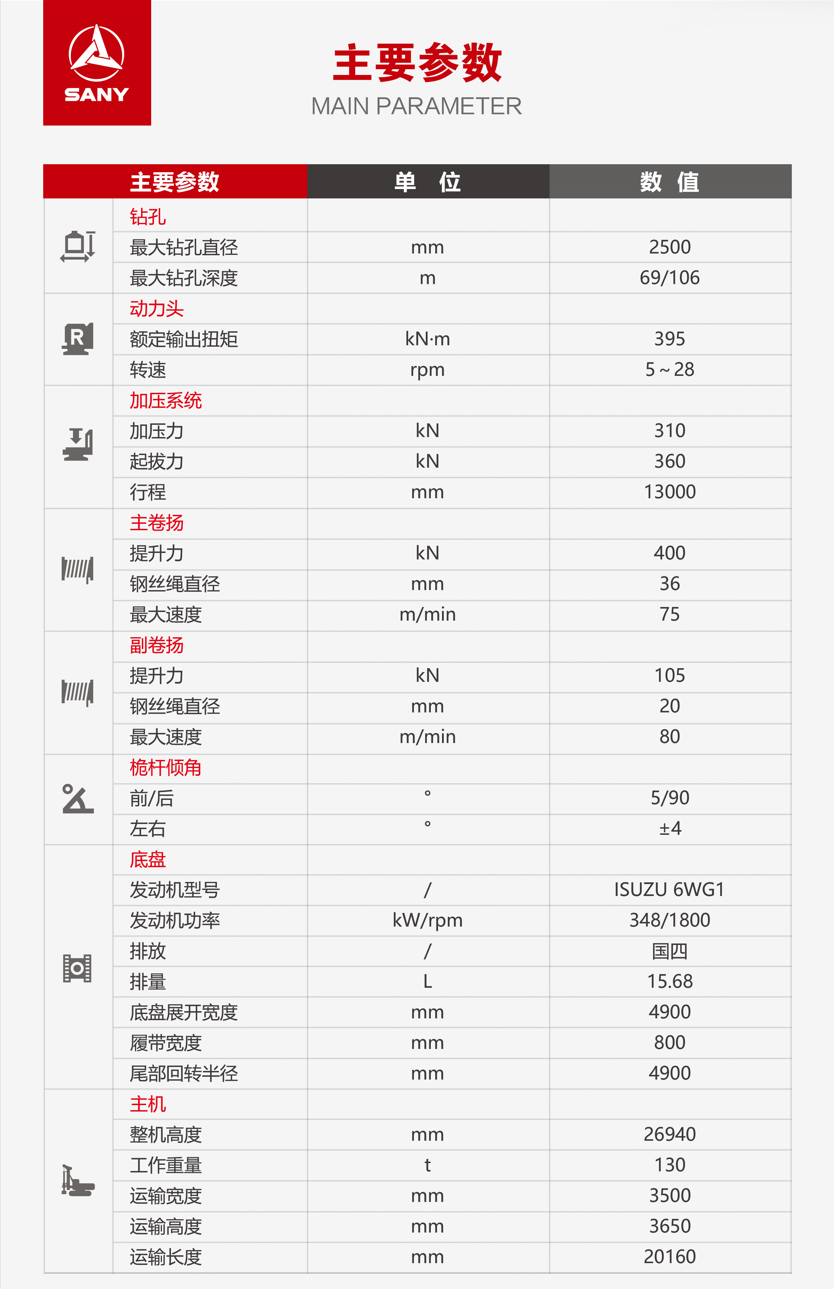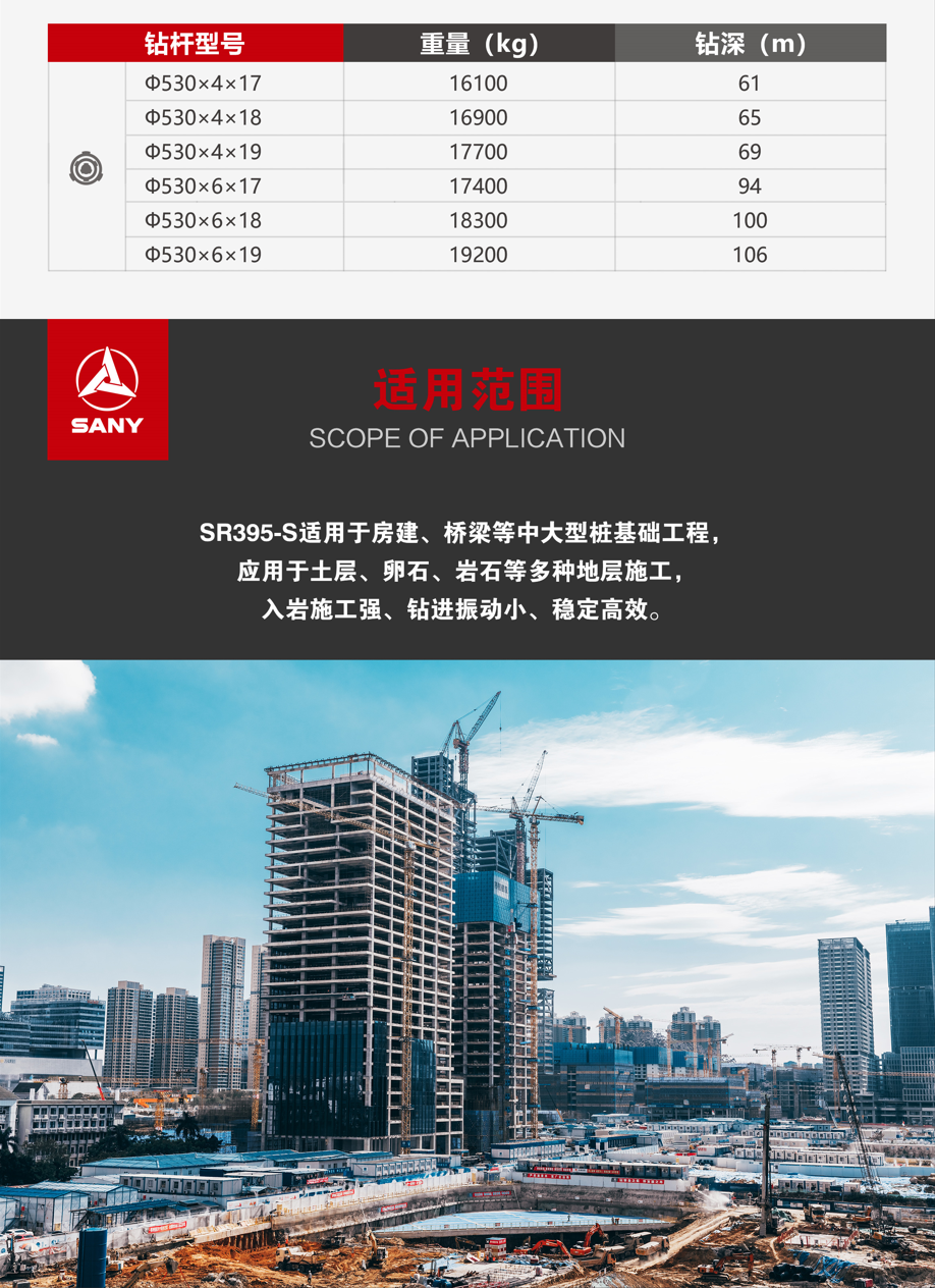 SR395-S适用于房建、桥梁等中大型桩基础工程,应用于土层、卵石、岩石等多种地层施工,入岩施工强、钻进振动小、稳定高效。