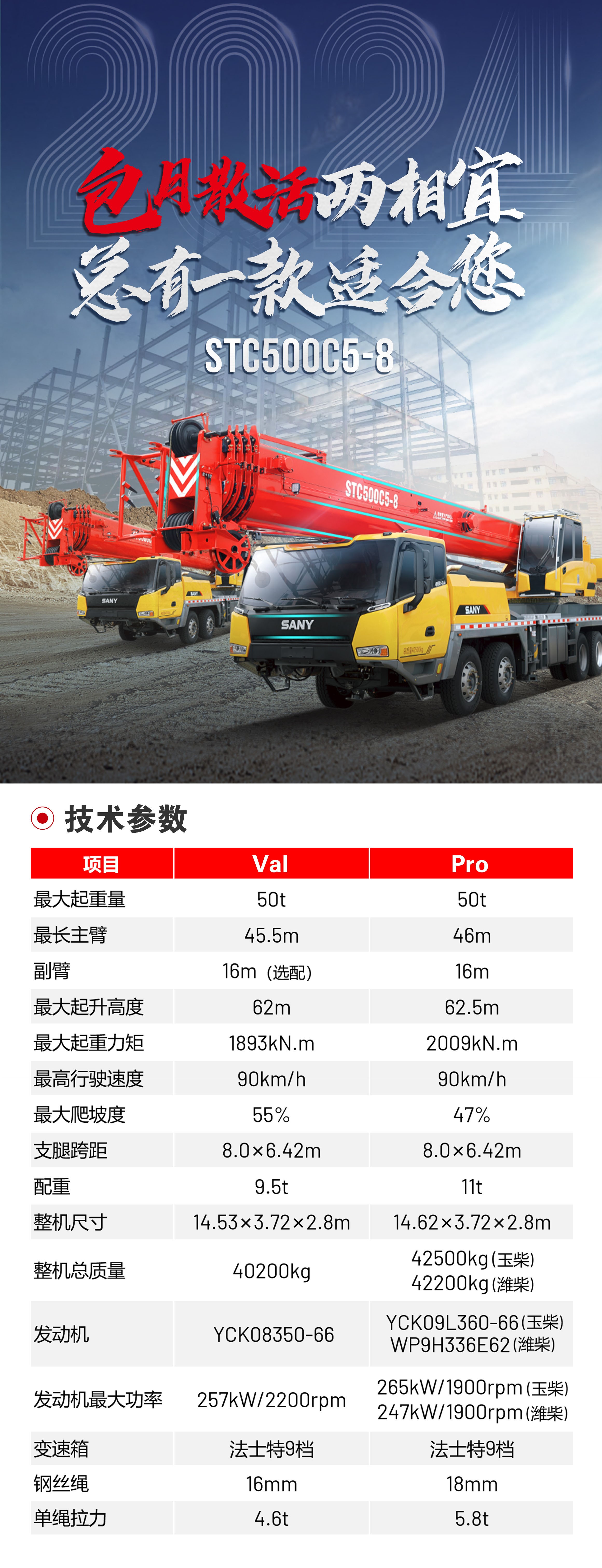 主臂最大起升高度: 46m (Val)、46.5m(Pro )