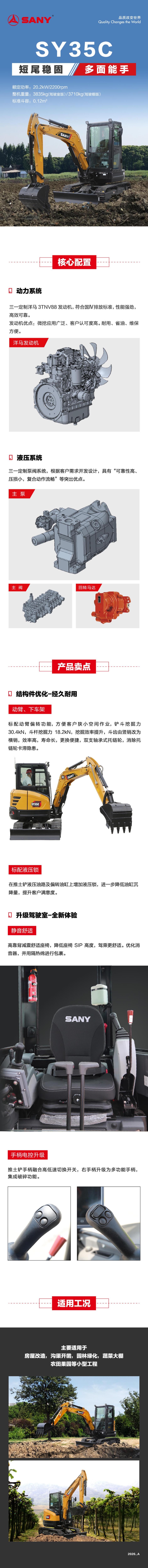 好体育综合app下载重机 SY35C 是在 SY35U 基础上倾力打造的一款 3-4T 级微型标准尾挖掘机产品,SY35U 以其独特的造型和高端的设计理念获得国际认可,成功摘得“中国设计红星奖” 与“金点设计奖”。SY35C 国四机围绕“新动力”、“新造型”、“新技术”全面升级,具有“超优性能、超高效率、超长寿命、超高舒适性”等特点,可适应不同国家及客户的需求。