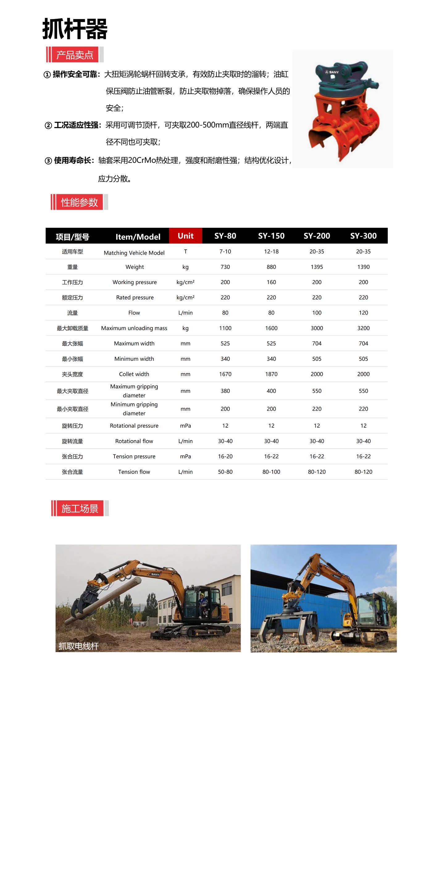 ① 操作安全可靠:大扭矩涡轮蜗杆回转支承,有效防止夹取时的溜转;油缸保压阀防止油管断裂,防止夹取物掉落,确保操作人员的安全;