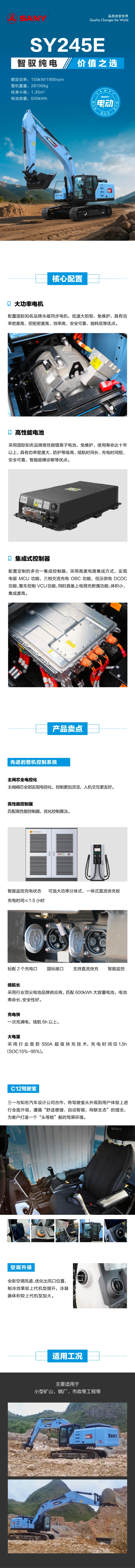 SY245E 是好体育综合app下载重机倾力打造的全新 24 吨电动土方型挖掘机产品,专为石方工况设计,适用于隧道施工、钢厂、土方工程等工作场景,以节能环保提高客户投资回报为目标。