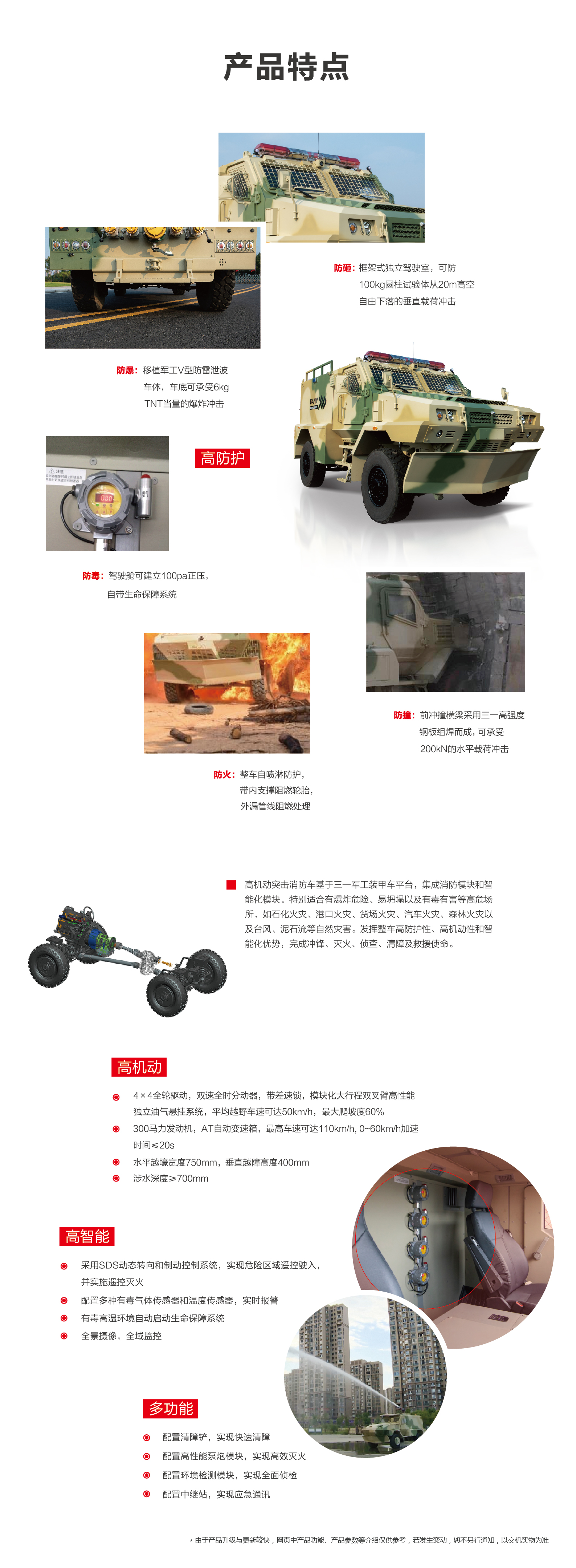 防爆:移植军工V型防雷泄波车体,车底可承受6kgTNT当量的爆炸冲击