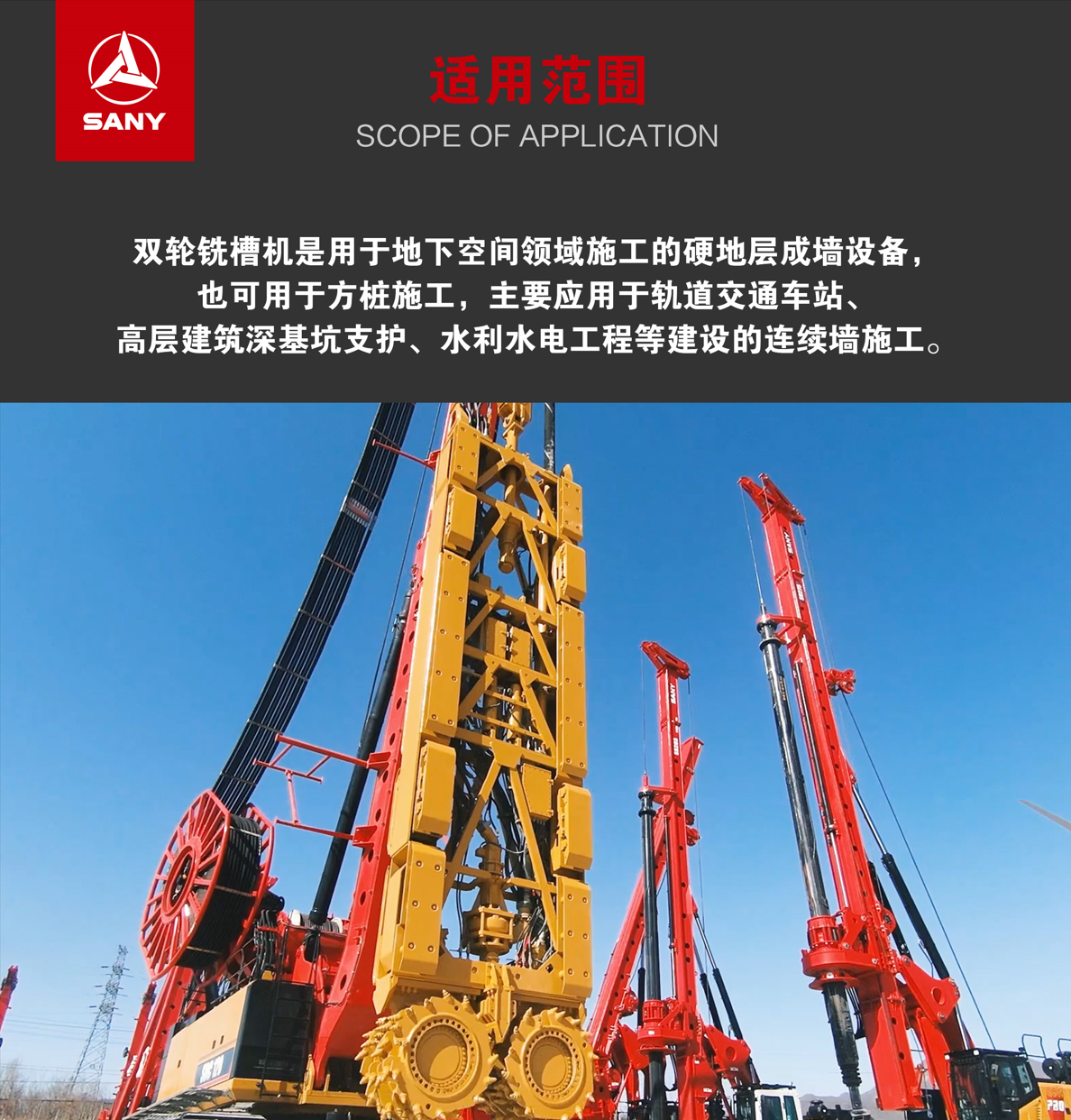 双轮铣槽机是用于地下空间领域施工的硬地层成墙设备,也可用于方桩施工,主要应用于轨道交通车站、高层建筑深基坑支护、水利水电工程等建设的连续墙施工。