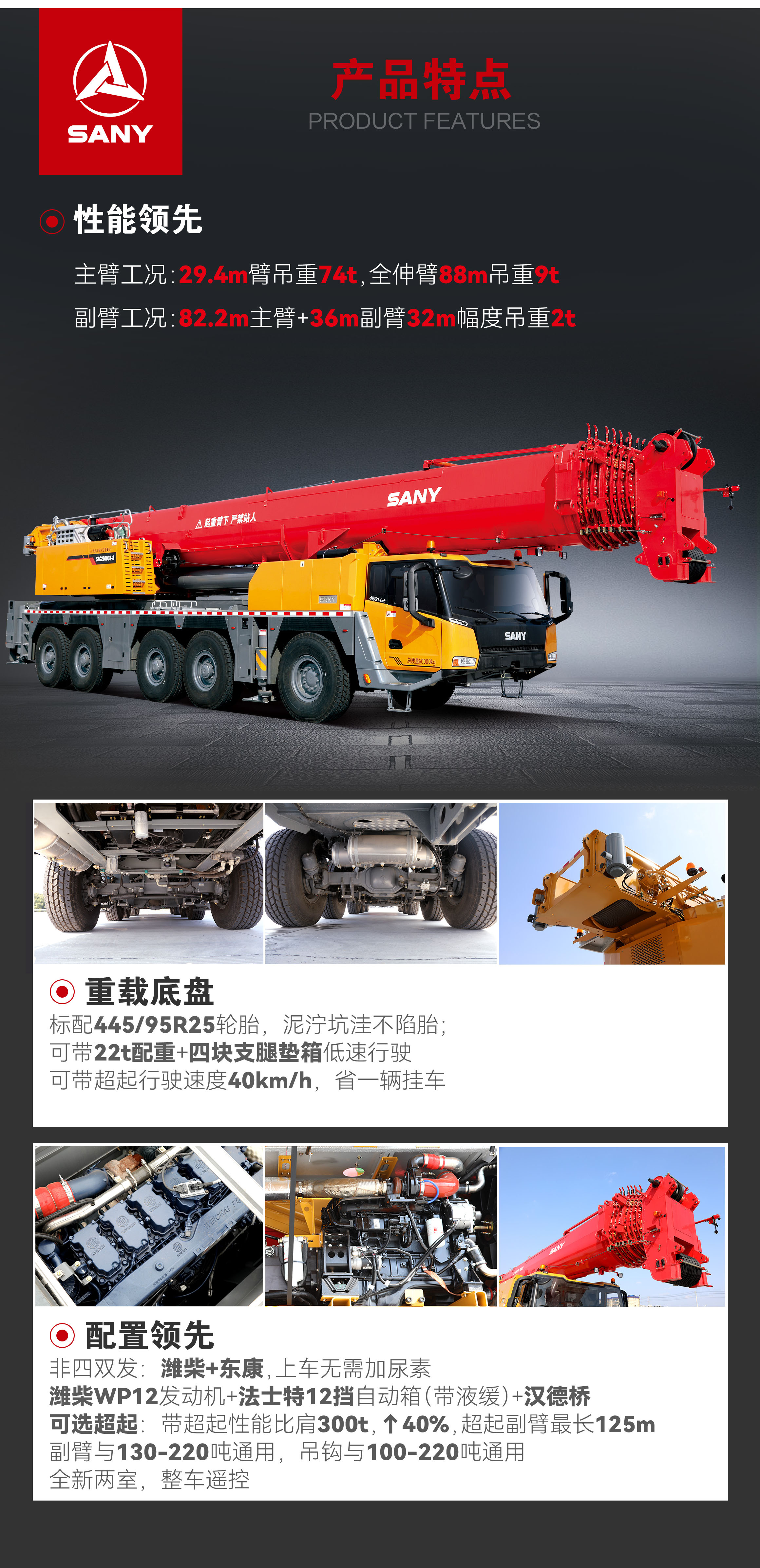 主臂工况:29.4m臂吊重74t,全伸臂88m吊重9t